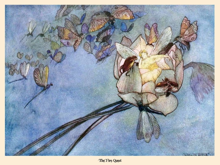 “The Firefly Queen was safe in her lotus bower with her beloved, who was as bright as she, for he was a great lord of the Fireflies. No need had he to go upon the Fire Quest. He carried the living flame beneath his wings.